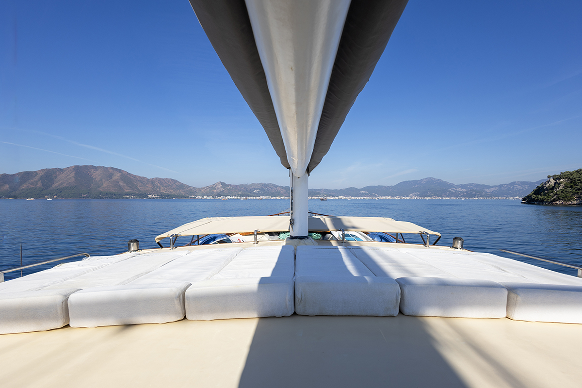 A.Candan offers a spacious deck ideal for both relaxation and social gatherings. The aft deck features a dining area with a sea view, while the foredeck provides large sunbathing mattresses, shaded seating, and lounging areas. Soft towels, tea towels, and comfortable cushions enhance the outdoor experience.