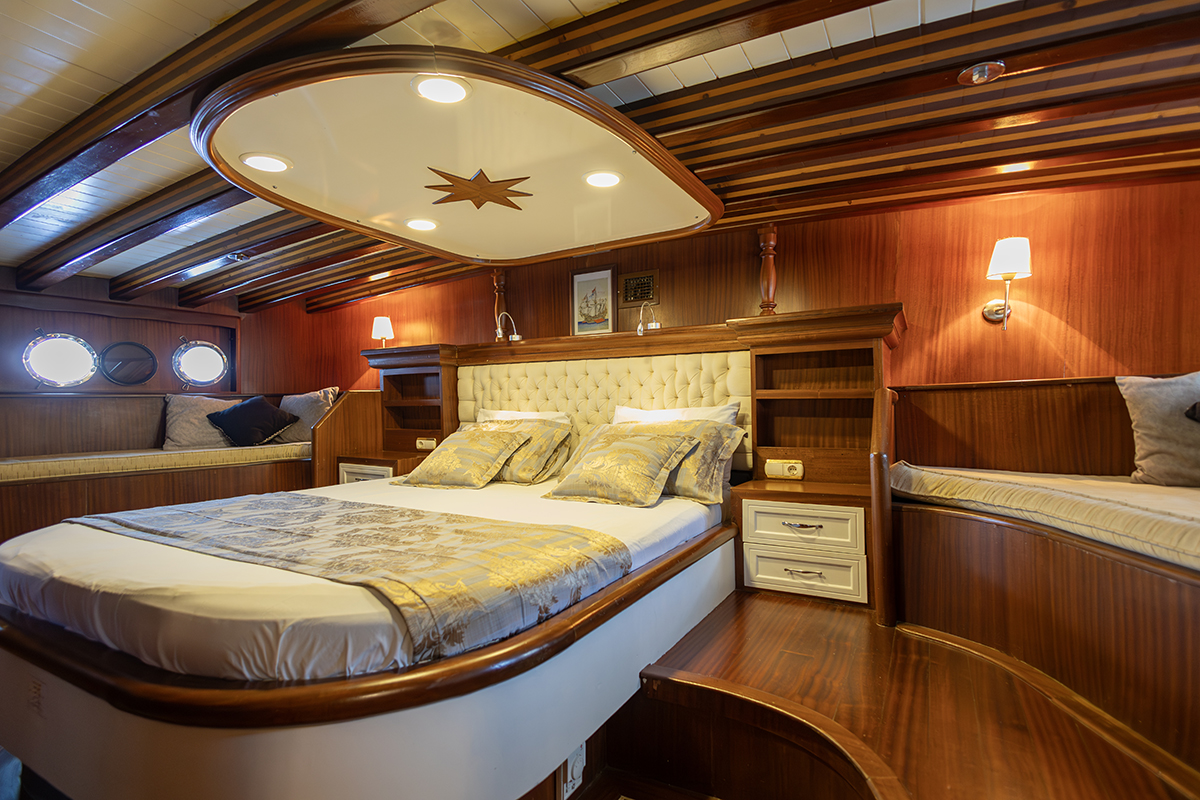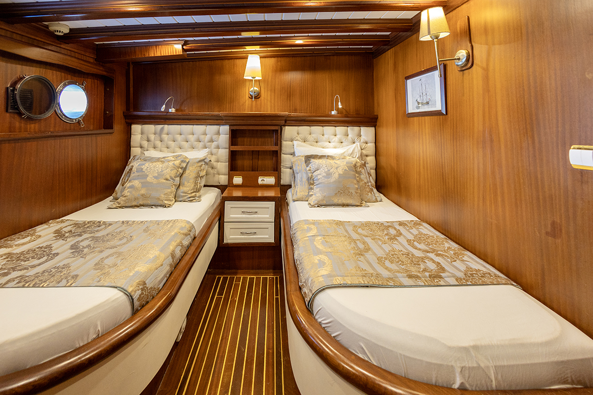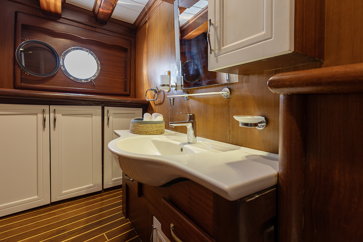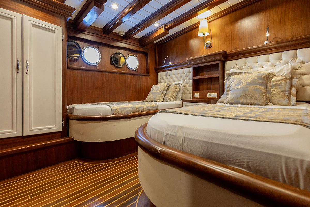 A.Candan has 8 cabins: 2 Master, 2 Double, 2 Triple, and 2 Twin, accommodating 18 guests (up to 20 including 2 baby beds). All cabins include air conditioning, en-suite bathrooms (shower & WC), towels, linens, hairdryer, and storage space. Elegant details and fine craftsmanship ensure a comfortable stay for every guest.