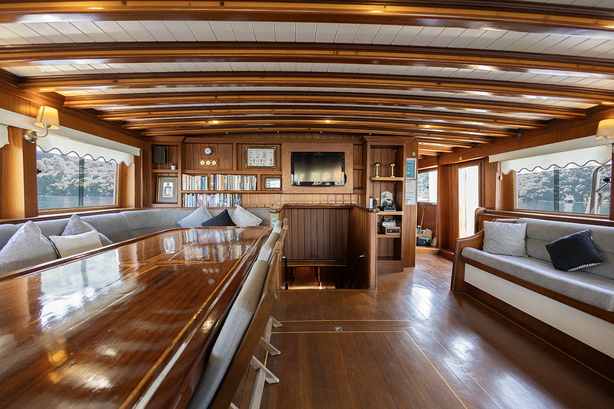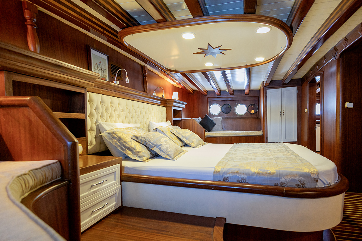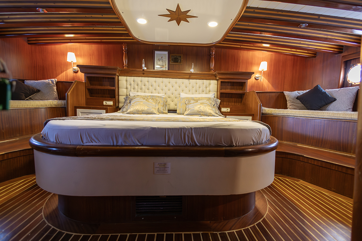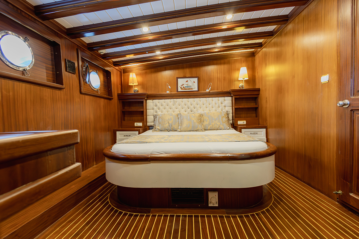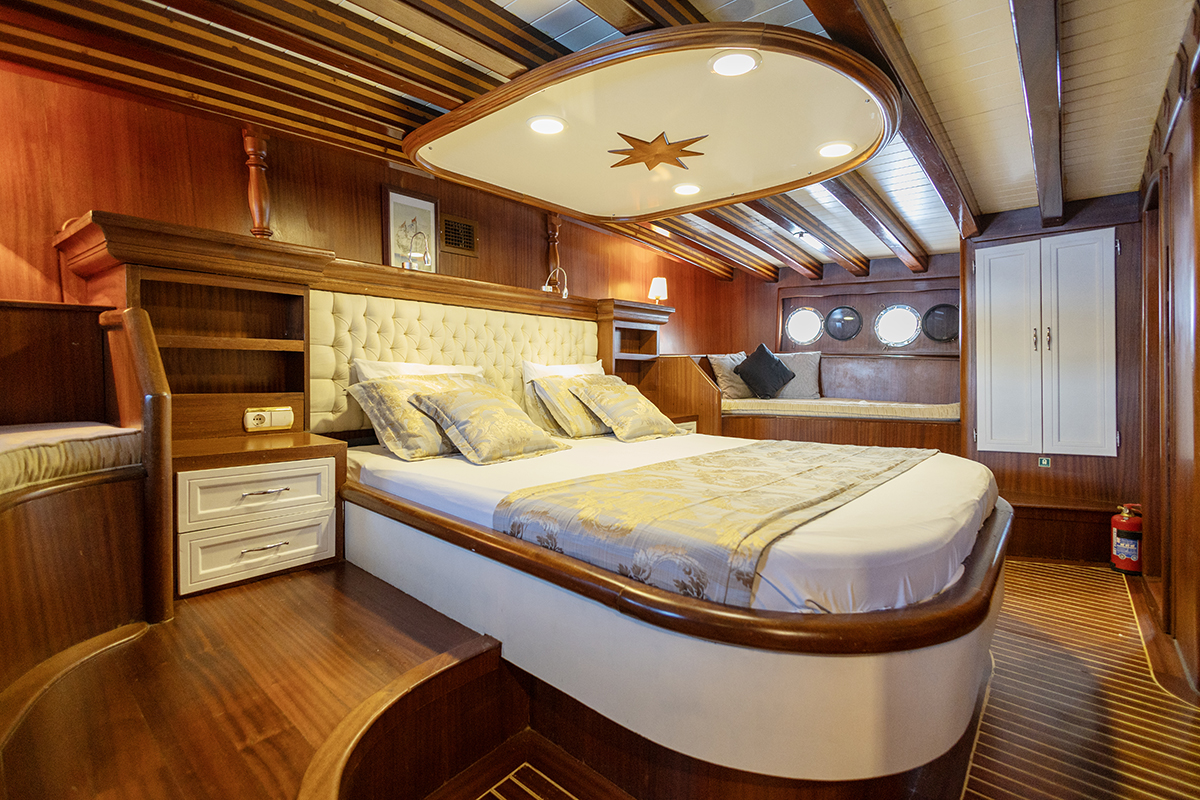 A.Candan has 8 cabins: 2 Master, 2 Double, 2 Triple, and 2 Twin, accommodating 18 guests (up to 20 including 2 baby beds). All cabins include air conditioning, en-suite bathrooms (shower & WC), towels, linens, hairdryer, and storage space. Elegant details and fine craftsmanship ensure a comfortable stay for every guest.