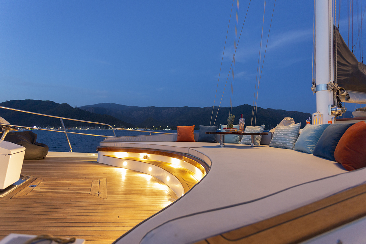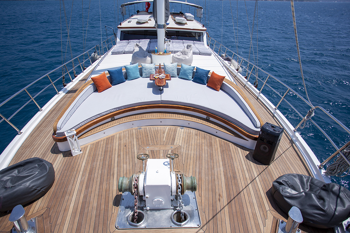 Sailing on request. Sun mattresses, sun awning for shade in front and aft of the yacht, leisure and dining area in the back side of the deck.